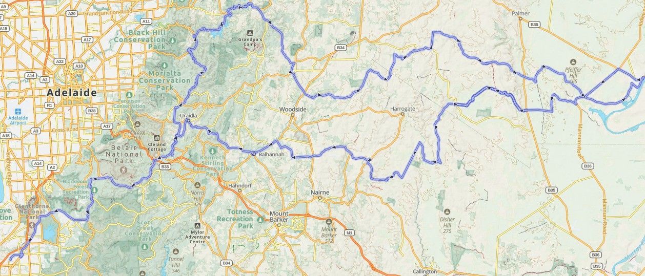 From Lobethal the route winds through classic Hills backroads, offering flowing gravel, open farmland, and forested sections before reaching Mannum on the Murray River — a logical fuel and bakery stop. After Mannum, the ride continues south-west on gravel and secondary roads toward Balhannah, finishing with a pub stop before looping back toward Crafers.