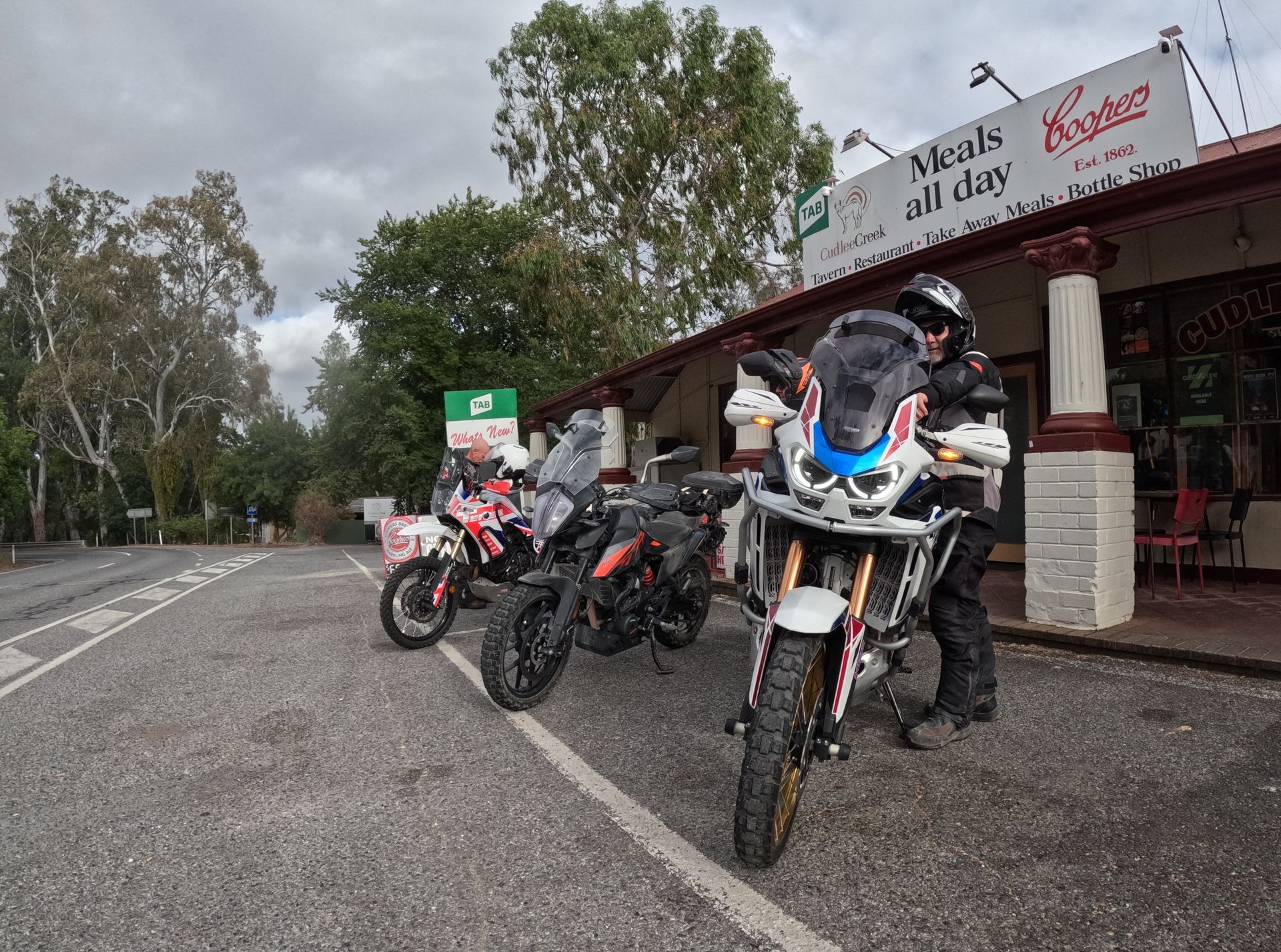By mid-arvo, we rolled into the Gumeracha Hotel, dusty, satisfied, and ready for a cold one. For a few blessed minutes, it was perfect — seven adventure bikes parked out front, the sound of clinking glasses, and that familiar sense of post-ride smugness.
