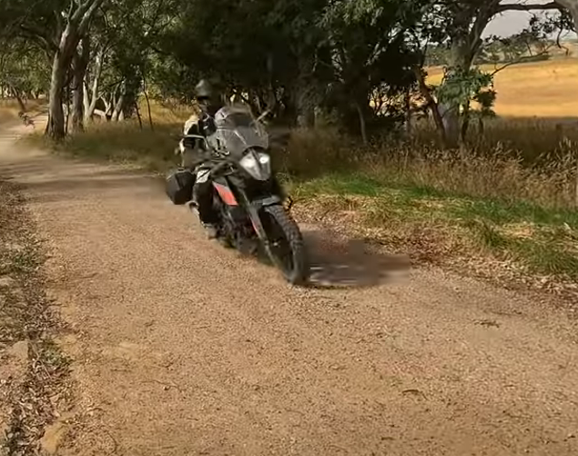 The first gravel of the day revealed the 390’s nervous side — light in the front and twitchier than a roo at closing time. Even at my modest 5'6", the standing position felt awkward; taller riders would have looked like contortionists on wheels. It’s clear KTM built this one from the Duke platform — fun on the hardtop, less convincing when the road turns to ruts.